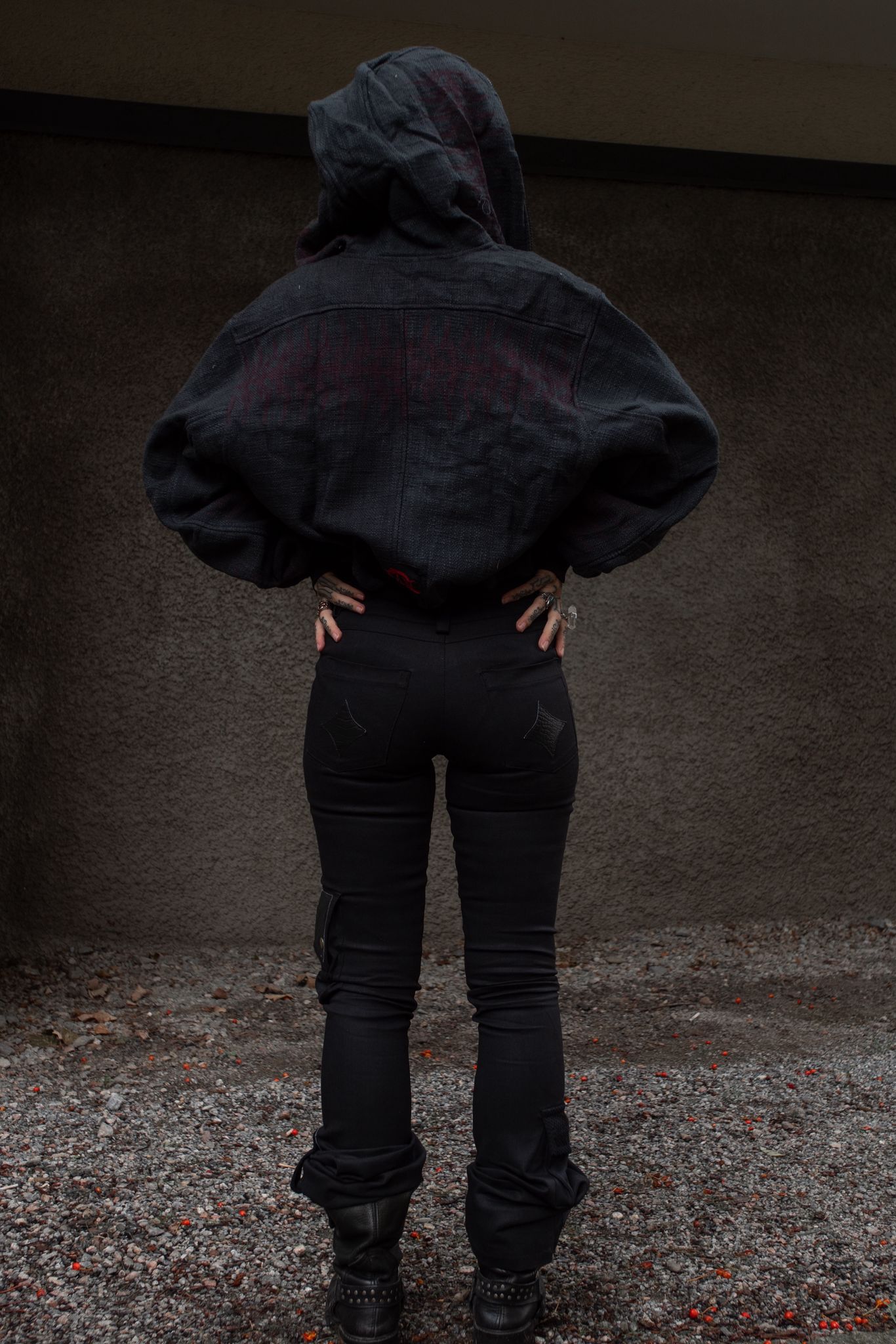 Black stretchy denim jeans with army pockets and adjustable length with straps with buttons. Leather and net details.