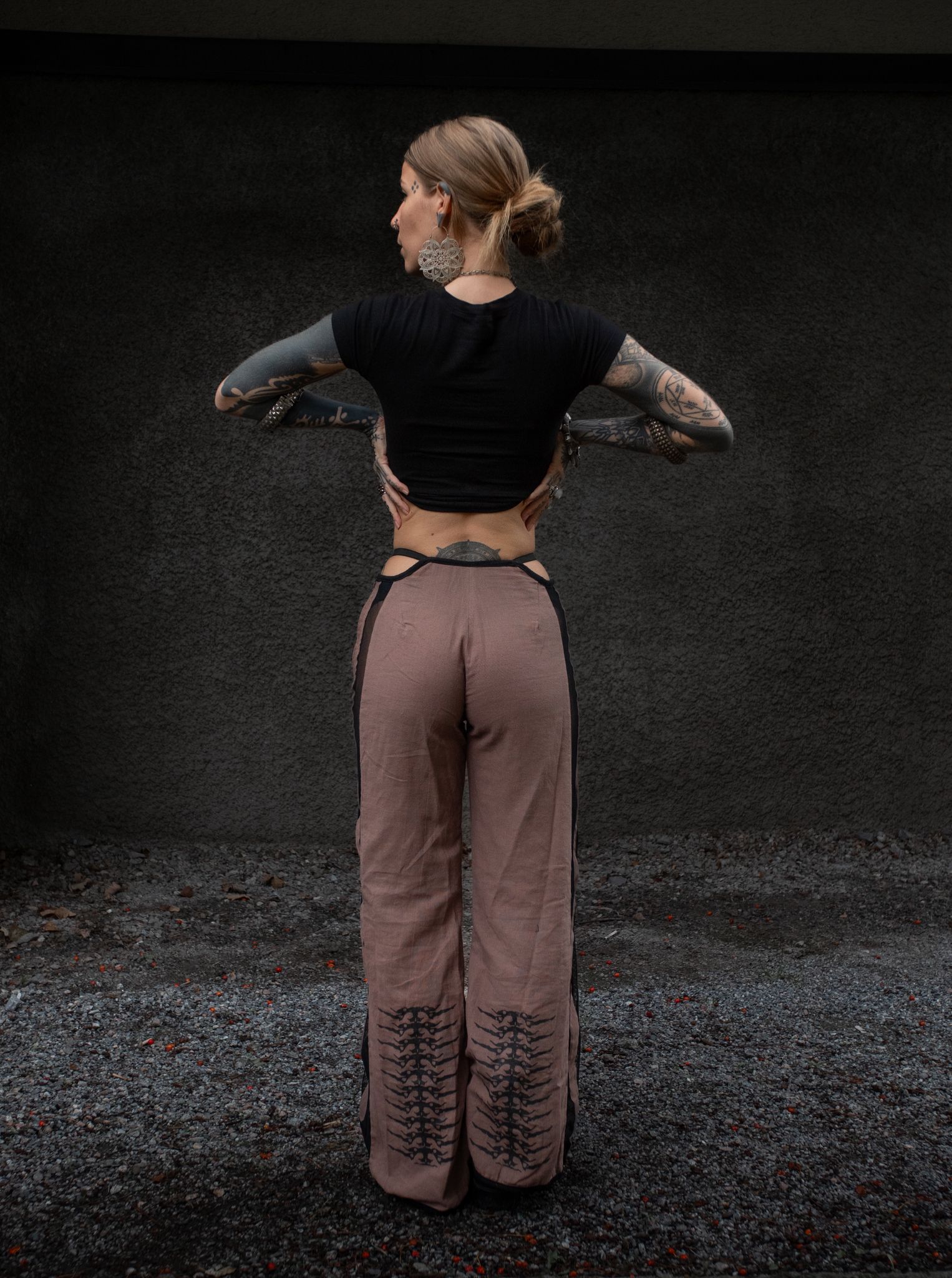 The high waste chi chi pant comes in pink beige and full black. 100% cotton material and elastic net on the sides for stretchy feeling. Elastic band on the waist on each side. Print collaboration with tatto artist black acid cult. Adjustable length, with strings that you button up for shorter length.