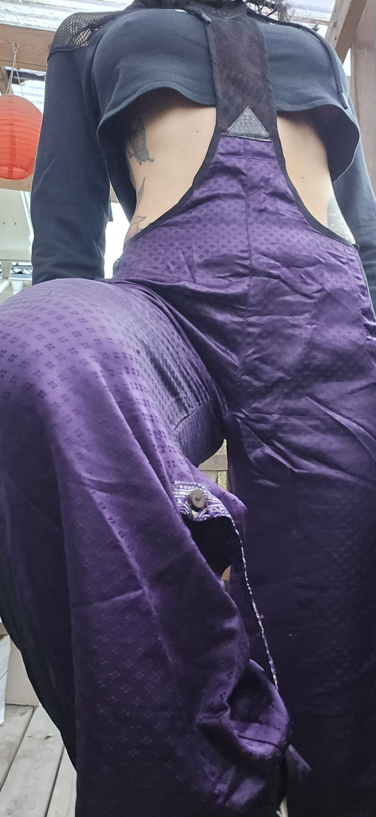 Limited edition suspender pants made from recycled rayon or silk saris sourced from Varanasi and Rajasthan, India. Each pair features elastic mesh side panels for stretch, durable double-layered fabric, and a bootcut shape.